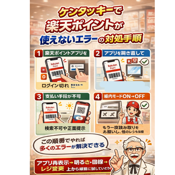 ケンタッキーは多くの店舗で楽天ポイントが貯まる・使える加盟店で、エラーの多くは「条件のズレ」や「順番の問題」で起きます。