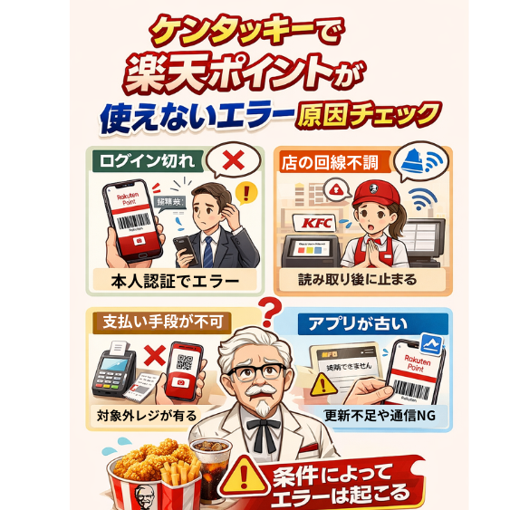 ケンタッキーで楽天ポイントが使えないエラーが出たら、まずはログイン状態と会員認証を確認してください。