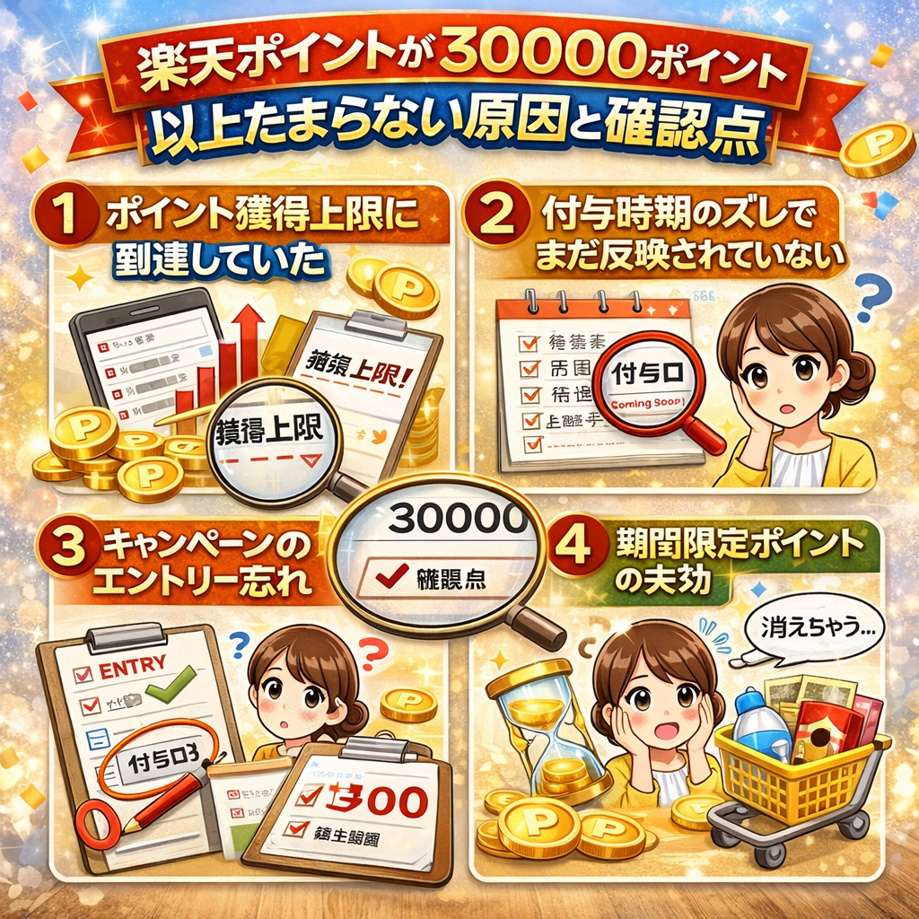 • 楽天ポイントが30000ポイント以上たまらないと感じるときは、まず前提の誤解を直すことが大切です。