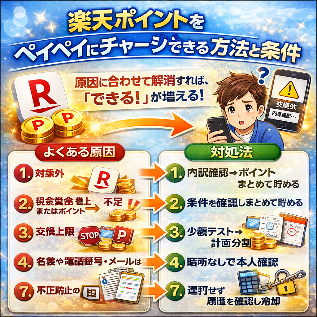 最後の「総括:楽天ポイントをペイペイにチャージする最短ルート」で、今日から迷わず動ける形にまとめます。