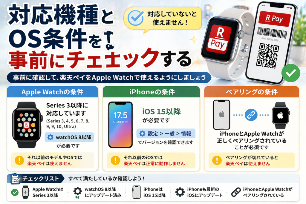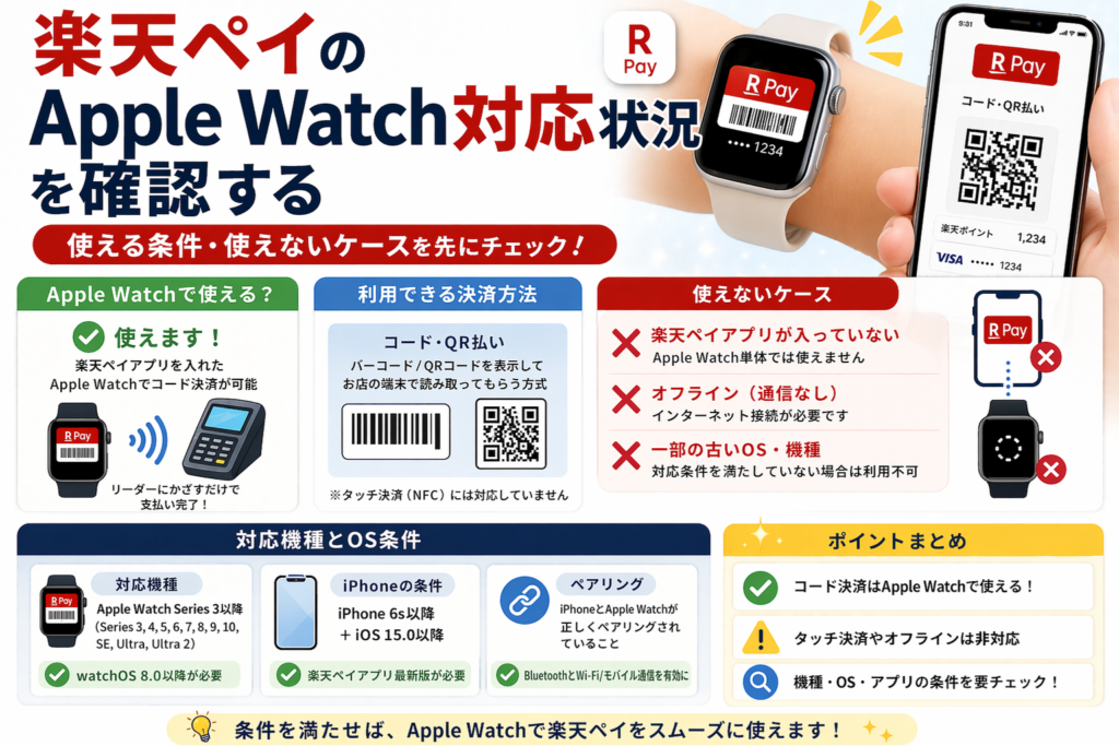 - Apple Watchでの楽天ペイ利用には、対応機種とOS条件があります