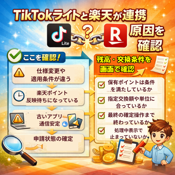 - 連携確認では、TikTok Lite側と楽天側の両方を見る必要があります